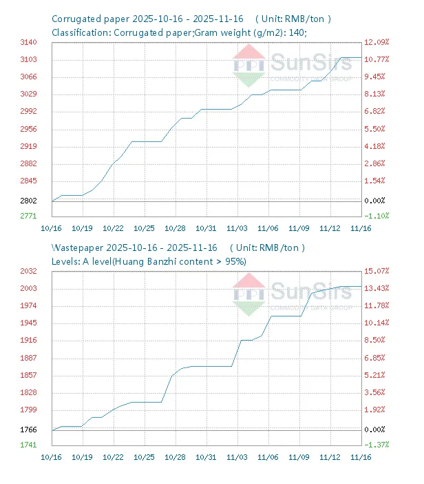 140g/m² ముడతలుగల కాగితం కోసం, ధరలు అక్టోబర్ 16 మరియు నవంబర్ 16, 2025 మధ్య 12.09% పెరిగాయి. సుదీర్ఘ విండోలో (ఆగస్టు 27 నుండి నవంబర్ 25 వరకు), సంచిత లాభాలు 20.99%కి చేరుకున్నాయి. నవంబర్ 24 నాటికి, తాజా ధర టన్నుకు 3170 RMBకి చేరుకుంది, చిన్న చిన్న సర్దుబాట్లు కొనసాగుతున్నాయి.